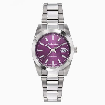مناسب برای: ‌خانم ها اصالت برند: سوئیس موتور (موومنت): کوارتز عملکرد پایه: ۳ عقربه گارانتی: سه ساله دیجیران سرویس قاب، بزل و صفحه جنس قاب (بدنه): استیل ضدزنگ جنس شیشه: کریستال سافایر قطر قاب (mm): 30 ضخامت قاب (mm): 10 جنس بزل: استیل ضدزنگ رنگ صفحه: ارغوانی بند: استیل ۳۱۶ ضدزنگ رنگ بند: سیلور امکانات: مقاومت در برابر آب تا ۵۰ متر نمایش تاریخ اندکس شب نما Limited Edition