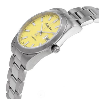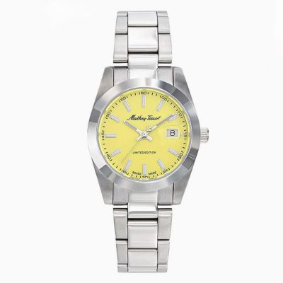 مناسب برای: ‌خانم ها اصالت برند: سوئیس موتور (موومنت): کوارتز عملکرد پایه: ۳ عقربه گارانتی: سه ساله دیجیران سرویس قاب، بزل و صفحه جنس قاب (بدنه): استیل ضدزنگ جنس شیشه: کریستال سافایر قطر قاب (mm): 30 ضخامت قاب (mm): 10 جنس بزل: استیل ضدزنگ رنگ صفحه: زرد بند: استیل ۳۱۶ ضدزنگ رنگ بند: سیلور امکانات: مقاومت در برابر آب تا ۵۰ متر نمایش تاریخ اندکس شب نما Limited Edition